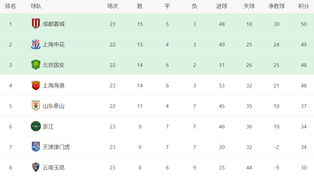 在积分榜上,成都蓉城暂时升到了榜首位置,总积分是50分。拿到49分的上海申花排名第2。北京国安以48分排名第3。输球的上海海港依然是48分,排名第4。不过,上海申花和北京国安这一轮还没有踢,榜首或许很快会再次易主。山东泰山以37分排名第5。第6的是浙江队,只拿到34分。天津津门虎也是34分,排名第7。