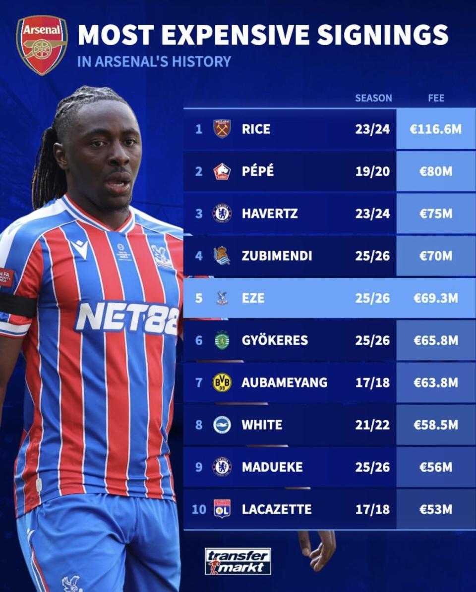 近日,英格兰攻击手埃泽以6930万欧元的高价从水晶宫转会至阿森纳,引发球迷和媒体的广泛关注。这笔重磅交易不仅刷新了埃泽的个人纪录,也直接推动了阿森纳队史引援榜的更新。知名足球数据机构《德国转会市场》也随即发布了最新的“阿森纳队史最贵引援榜”,全面盘点了球队在转会市场上的大手笔操作。